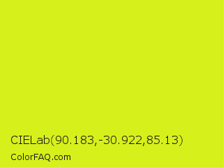 CIELab 90.183,-30.922,85.13 Color is a normal yellow color and the nearest color is Arctic Lime #d0ff14. Hex code #d6f01c and RGB value is rgb(214,240,28). In RGB color space, this color is composed of 84% red, 94% green, 11% blue, In CMYK color space, this color is composed of 11% cyan, 0% magenta, 88% yellow , 6% black , In HSL color space, this color has a hue angle of 67° , 88% saturation and 53% lightness.