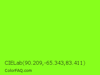 CIELab 90.209,-65.343,83.411 Color is a normal green color and the nearest color is Spring Frost #87ff2a. Hex code #87ff1c and RGB value is rgb(135,255,28). In RGB color space, this color is composed of 53% red, 100% green, 11% blue, In CMYK color space, this color is composed of 47% cyan, 0% magenta, 89% yellow , 0% black , In HSL color space, this color has a hue angle of 92° , 100% saturation and 55% lightness.