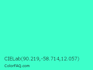 CIELab 90.219,-58.714,12.057 Color is a light cyan color and the nearest color is Turquoise #40e0d0. Hex code #3dffca and RGB value is rgb(61,255,202). In RGB color space, this color is composed of 24% red, 100% green, 79% blue, In CMYK color space, this color is composed of 76% cyan, 0% magenta, 21% yellow , 0% black , In HSL color space, this color has a hue angle of 164° , 100% saturation and 62% lightness.