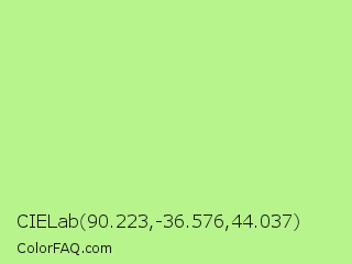 CIELab 90.223,-36.576,44.037 Color is a light green color and the nearest color is Sulu #c1f07c. Hex code #b8f48c and RGB value is rgb(184,244,140). In RGB color space, this color is composed of 72% red, 96% green, 55% blue, In CMYK color space, this color is composed of 25% cyan, 0% magenta, 43% yellow , 4% black , In HSL color space, this color has a hue angle of 95° , 83% saturation and 75% lightness.