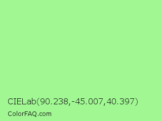 CIELab 90.238,-45.007,40.397 Color is a light green color and the nearest color is Pale Green #98fb98. Hex code #a1f893 and RGB value is rgb(161,248,147). In RGB color space, this color is composed of 63% red, 97% green, 58% blue, In CMYK color space, this color is composed of 35% cyan, 0% magenta, 41% yellow , 3% black , In HSL color space, this color has a hue angle of 112° , 88% saturation and 77% lightness.