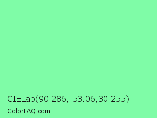 CIELab 90.286,-53.06,30.255 Color is a light green color and the nearest color is Pale Green #98fb98. Hex code #7ffca7 and RGB value is rgb(127,252,167). In RGB color space, this color is composed of 50% red, 99% green, 65% blue, In CMYK color space, this color is composed of 50% cyan, 0% magenta, 34% yellow , 1% black , In HSL color space, this color has a hue angle of 139° , 95% saturation and 74% lightness.