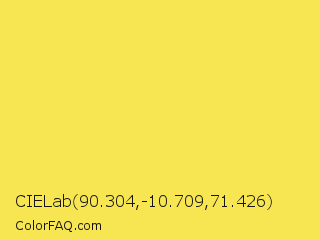 CIELab 90.304,-10.709,71.426 Color is a light yellow color and the nearest color is Minion Yellow #f5e050. Hex code #f7e651 and RGB value is rgb(247,230,81). In RGB color space, this color is composed of 97% red, 90% green, 32% blue, In CMYK color space, this color is composed of 0% cyan, 7% magenta, 67% yellow , 3% black , In HSL color space, this color has a hue angle of 54° , 91% saturation and 64% lightness.