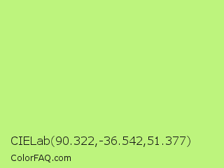 CIELab 90.322,-36.542,51.377 Color is a light green color and the nearest color is Sulu #c1f07c. Hex code #bdf47d and RGB value is rgb(189,244,125). In RGB color space, this color is composed of 74% red, 96% green, 49% blue, In CMYK color space, this color is composed of 23% cyan, 0% magenta, 49% yellow , 4% black , In HSL color space, this color has a hue angle of 88° , 84% saturation and 72% lightness.