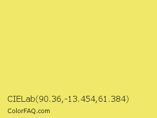 CIELab 90.36,-13.454,61.384 Color is a light yellow color and the nearest color is Portica #f9e663. Hex code #efe869 and RGB value is rgb(239,232,105). In RGB color space, this color is composed of 94% red, 91% green, 41% blue, In CMYK color space, this color is composed of 0% cyan, 3% magenta, 56% yellow , 6% black , In HSL color space, this color has a hue angle of 57° , 81% saturation and 67% lightness.