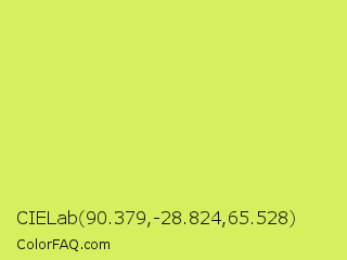 CIELab 90.379,-28.824,65.528 Color is a light lime color and the nearest color is Maximum Green Yellow #d9e650. Hex code #d4f05e and RGB value is rgb(212,240,94). In RGB color space, this color is composed of 83% red, 94% green, 37% blue, In CMYK color space, this color is composed of 12% cyan, 0% magenta, 61% yellow , 6% black , In HSL color space, this color has a hue angle of 72° , 83% saturation and 65% lightness.
