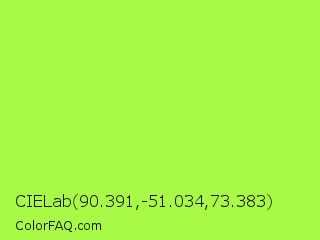 CIELab 90.391,-51.034,73.383 Color is a light green color and the nearest color is French Lime #9efd38. Hex code #a8fa47 and RGB value is rgb(168,250,71). In RGB color space, this color is composed of 66% red, 98% green, 28% blue, In CMYK color space, this color is composed of 33% cyan, 0% magenta, 72% yellow , 2% black , In HSL color space, this color has a hue angle of 87° , 95% saturation and 63% lightness.