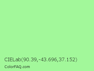 CIELab 90.39,-43.696,37.152 Color is a light green color and the nearest color is Pale Green #98fb98. Hex code #a2f89a and RGB value is rgb(162,248,154). In RGB color space, this color is composed of 64% red, 97% green, 60% blue, In CMYK color space, this color is composed of 35% cyan, 0% magenta, 38% yellow , 3% black , In HSL color space, this color has a hue angle of 115° , 87% saturation and 79% lightness.