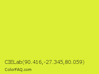CIELab 90.416,-27.345,80.059 Color is a normal yellow color and the nearest color is Pear #d1e231. Hex code #dcef35 and RGB value is rgb(220,239,53). In RGB color space, this color is composed of 86% red, 94% green, 21% blue, In CMYK color space, this color is composed of 8% cyan, 0% magenta, 78% yellow , 6% black , In HSL color space, this color has a hue angle of 66° , 85% saturation and 57% lightness.