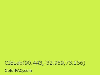 CIELab 90.443,-32.959,73.156 Color is a light lime color and the nearest color is Maximum Green Yellow #d9e650. Hex code #cff24a and RGB value is rgb(207,242,74). In RGB color space, this color is composed of 81% red, 95% green, 29% blue, In CMYK color space, this color is composed of 14% cyan, 0% magenta, 69% yellow , 5% black , In HSL color space, this color has a hue angle of 73° , 87% saturation and 62% lightness.