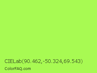 CIELab 90.462,-50.324,69.543 Color is a light green color and the nearest color is Inchworm #b2ec5d. Hex code #a8fa52 and RGB value is rgb(168,250,82). In RGB color space, this color is composed of 66% red, 98% green, 32% blue, In CMYK color space, this color is composed of 33% cyan, 0% magenta, 67% yellow , 2% black , In HSL color space, this color has a hue angle of 89° , 94% saturation and 65% lightness.