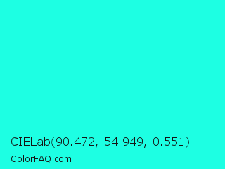 CIELab 90.472,-54.949,-0.551 Color is a normal cyan color and the nearest color is Loeen #15f2fd. Hex code #1dffe3 and RGB value is rgb(29,255,227). In RGB color space, this color is composed of 11% red, 100% green, 89% blue, In CMYK color space, this color is composed of 89% cyan, 0% magenta, 11% yellow , 0% black , In HSL color space, this color has a hue angle of 173° , 100% saturation and 56% lightness.