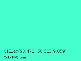 CIELab 90.472,-56.523,9.859 Color is a light cyan color and the nearest color is Turquoise #40e0d0. Hex code #46ffcf and RGB value is rgb(70,255,207). In RGB color space, this color is composed of 27% red, 100% green, 81% blue, In CMYK color space, this color is composed of 73% cyan, 0% magenta, 19% yellow , 0% black , In HSL color space, this color has a hue angle of 164° , 100% saturation and 64% lightness.