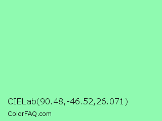 CIELab 90.48,-46.52,26.071 Color is a light green color and the nearest color is Teal Deer #99e6b3. Hex code #8ffab0 and RGB value is rgb(143,250,176). In RGB color space, this color is composed of 56% red, 98% green, 69% blue, In CMYK color space, this color is composed of 43% cyan, 0% magenta, 30% yellow , 2% black , In HSL color space, this color has a hue angle of 139° , 91% saturation and 77% lightness.