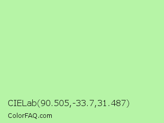CIELab 90.505,-33.7,31.487 Color is a light green color and the nearest color is Granny Smith Apple #a8e4a0. Hex code #b6f4a6 and RGB value is rgb(182,244,166). In RGB color space, this color is composed of 71% red, 96% green, 65% blue, In CMYK color space, this color is composed of 25% cyan, 0% magenta, 32% yellow , 4% black , In HSL color space, this color has a hue angle of 108° , 78% saturation and 80% lightness.