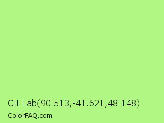 CIELab 90.513,-41.621,48.148 Color is a light green color and the nearest color is Sulu #c1f07c. Hex code #b0f784 and RGB value is rgb(176,247,132). In RGB color space, this color is composed of 69% red, 97% green, 52% blue, In CMYK color space, this color is composed of 29% cyan, 0% magenta, 47% yellow , 3% black , In HSL color space, this color has a hue angle of 97° , 88% saturation and 74% lightness.