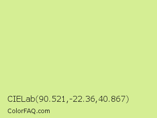 CIELab 90.521,-22.36,40.867 Color is a light lime color and the nearest color is Deco #d2da97. Hex code #d5ee94 and RGB value is rgb(213,238,148). In RGB color space, this color is composed of 84% red, 93% green, 58% blue, In CMYK color space, this color is composed of 11% cyan, 0% magenta, 38% yellow , 7% black , In HSL color space, this color has a hue angle of 77° , 73% saturation and 76% lightness.