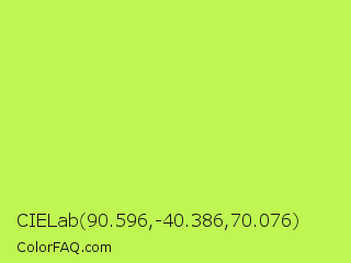CIELab 90.596,-40.386,70.076 Color is a light green color and the nearest color is Inchworm #b2ec5d. Hex code #bff652 and RGB value is rgb(191,246,82). In RGB color space, this color is composed of 75% red, 96% green, 32% blue, In CMYK color space, this color is composed of 22% cyan, 0% magenta, 67% yellow , 4% black , In HSL color space, this color has a hue angle of 80° , 90% saturation and 64% lightness.