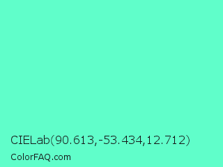 CIELab 90.613,-53.434,12.712 Color is a light green color and the nearest color is Aquamarine #7fffd4. Hex code #60feca and RGB value is rgb(96,254,202). In RGB color space, this color is composed of 38% red, 100% green, 79% blue, In CMYK color space, this color is composed of 62% cyan, 0% magenta, 20% yellow , 0% black , In HSL color space, this color has a hue angle of 160° , 99% saturation and 69% lightness.