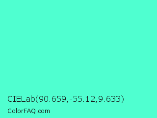 CIELab 90.659,-55.12,9.633 Color is a light cyan color and the nearest color is Turquoise #40e0d0. Hex code #4fffd0 and RGB value is rgb(79,255,208). In RGB color space, this color is composed of 31% red, 100% green, 82% blue, In CMYK color space, this color is composed of 69% cyan, 0% magenta, 18% yellow , 0% black , In HSL color space, this color has a hue angle of 164° , 100% saturation and 65% lightness.