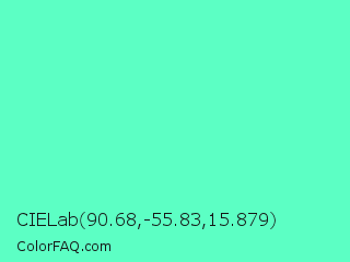 CIELab 90.68,-55.83,15.879 Color is a light green color and the nearest color is Aquamarine #7fffd4. Hex code #5cffc4 and RGB value is rgb(92,255,196). In RGB color space, this color is composed of 36% red, 100% green, 77% blue, In CMYK color space, this color is composed of 64% cyan, 0% magenta, 23% yellow , 0% black , In HSL color space, this color has a hue angle of 158° , 100% saturation and 68% lightness.