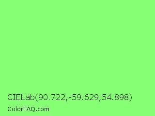 CIELab 90.722,-59.629,54.898 Color is a light green color and the nearest color is Light Green #90ee90. Hex code #86ff75 and RGB value is rgb(134,255,117). In RGB color space, this color is composed of 53% red, 100% green, 46% blue, In CMYK color space, this color is composed of 47% cyan, 0% magenta, 54% yellow , 0% black , In HSL color space, this color has a hue angle of 113° , 100% saturation and 73% lightness.