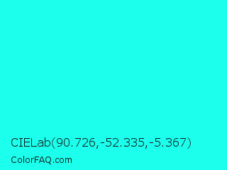 CIELab 90.726,-52.335,-5.367 Color is a normal cyan color and the nearest color is Loeen #15f2fd. Hex code #1cffed and RGB value is rgb(28,255,237). In RGB color space, this color is composed of 11% red, 100% green, 93% blue, In CMYK color space, this color is composed of 89% cyan, 0% magenta, 7% yellow , 0% black , In HSL color space, this color has a hue angle of 175° , 100% saturation and 55% lightness.