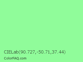 CIELab 90.727,-50.71,37.44 Color is a light green color and the nearest color is Pale Green #98fb98. Hex code #90fc9a and RGB value is rgb(144,252,154). In RGB color space, this color is composed of 56% red, 99% green, 60% blue, In CMYK color space, this color is composed of 43% cyan, 0% magenta, 39% yellow , 1% black , In HSL color space, this color has a hue angle of 126° , 95% saturation and 78% lightness.