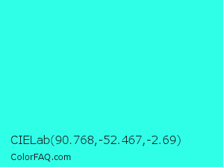 CIELab 90.768,-52.467,-2.69 Color is a normal cyan color and the nearest color is Loeen #15f2fd. Hex code #30ffe8 and RGB value is rgb(48,255,232). In RGB color space, this color is composed of 19% red, 100% green, 91% blue, In CMYK color space, this color is composed of 81% cyan, 0% magenta, 9% yellow , 0% black , In HSL color space, this color has a hue angle of 173° , 100% saturation and 59% lightness.