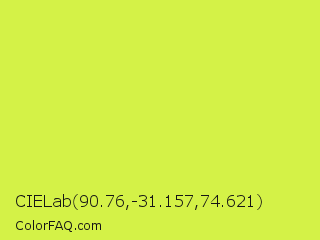 CIELab 90.76,-31.157,74.621 Color is a light lime color and the nearest color is Maximum Green Yellow #d9e650. Hex code #d4f247 and RGB value is rgb(212,242,71). In RGB color space, this color is composed of 83% red, 95% green, 28% blue, In CMYK color space, this color is composed of 12% cyan, 0% magenta, 71% yellow , 5% black , In HSL color space, this color has a hue angle of 71° , 87% saturation and 61% lightness.