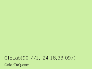 CIELab 90.771,-24.18,33.097 Color is a light green color and the nearest color is Gossip #d2f8b0. Hex code #cdf0a4 and RGB value is rgb(205,240,164). In RGB color space, this color is composed of 80% red, 94% green, 64% blue, In CMYK color space, this color is composed of 15% cyan, 0% magenta, 32% yellow , 6% black , In HSL color space, this color has a hue angle of 88° , 72% saturation and 79% lightness.