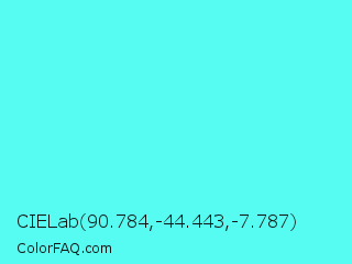 CIELab 90.784,-44.443,-7.787 Color is a light cyan color and the nearest color is Electric Blue #7df9ff. Hex code #56fcf2 and RGB value is rgb(86,252,242). In RGB color space, this color is composed of 34% red, 99% green, 95% blue, In CMYK color space, this color is composed of 66% cyan, 0% magenta, 4% yellow , 1% black , In HSL color space, this color has a hue angle of 176° , 97% saturation and 66% lightness.