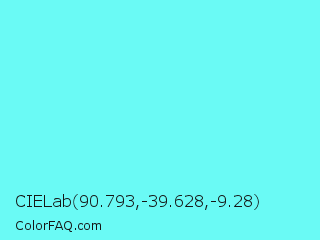 CIELab 90.793,-39.628,-9.28 Color is a light cyan color and the nearest color is Electric Blue #7df9ff. Hex code #6afaf5 and RGB value is rgb(106,250,245). In RGB color space, this color is composed of 42% red, 98% green, 96% blue, In CMYK color space, this color is composed of 58% cyan, 0% magenta, 2% yellow , 2% black , In HSL color space, this color has a hue angle of 178° , 94% saturation and 70% lightness.