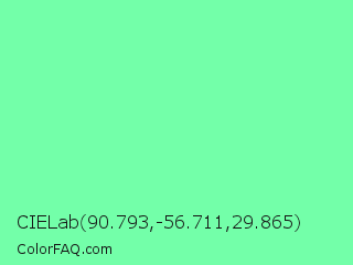 CIELab 90.793,-56.711,29.865 Color is a light green color and the nearest color is Medium Aquamarine #66ddaa. Hex code #73ffa9 and RGB value is rgb(115,255,169). In RGB color space, this color is composed of 45% red, 100% green, 66% blue, In CMYK color space, this color is composed of 55% cyan, 0% magenta, 34% yellow , 0% black , In HSL color space, this color has a hue angle of 143° , 100% saturation and 73% lightness.