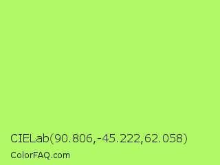 CIELab 90.806,-45.222,62.058 Color is a light green color and the nearest color is Inchworm #b2ec5d. Hex code #b1f966 and RGB value is rgb(177,249,102). In RGB color space, this color is composed of 69% red, 98% green, 40% blue, In CMYK color space, this color is composed of 29% cyan, 0% magenta, 59% yellow , 2% black , In HSL color space, this color has a hue angle of 89° , 92% saturation and 69% lightness.