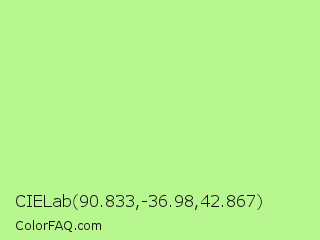 CIELab 90.833,-36.98,42.867 Color is a light green color and the nearest color is Sulu #c1f07c. Hex code #b8f690 and RGB value is rgb(184,246,144). In RGB color space, this color is composed of 72% red, 96% green, 56% blue, In CMYK color space, this color is composed of 25% cyan, 0% magenta, 41% yellow , 4% black , In HSL color space, this color has a hue angle of 96° , 85% saturation and 76% lightness.