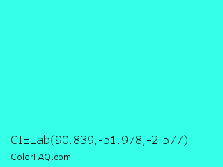 CIELab 90.839,-51.978,-2.577 Color is a light cyan color and the nearest color is Turquoise #40e0d0. Hex code #36ffe8 and RGB value is rgb(54,255,232). In RGB color space, this color is composed of 21% red, 100% green, 91% blue, In CMYK color space, this color is composed of 79% cyan, 0% magenta, 9% yellow , 0% black , In HSL color space, this color has a hue angle of 173° , 100% saturation and 61% lightness.