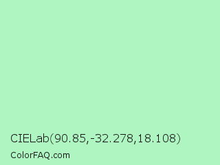 CIELab 90.85,-32.278,18.108 Color is a very light green color and the nearest color is Madang #b7f0be. Hex code #aef5c1 and RGB value is rgb(174,245,193). In RGB color space, this color is composed of 68% red, 96% green, 76% blue, In CMYK color space, this color is composed of 29% cyan, 0% magenta, 21% yellow , 4% black , In HSL color space, this color has a hue angle of 136° , 78% saturation and 82% lightness.