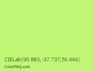 CIELab 90.883,-37.737,56.666 Color is a light green color and the nearest color is Sulu #c1f07c. Hex code #bff673 and RGB value is rgb(191,246,115). In RGB color space, this color is composed of 75% red, 96% green, 45% blue, In CMYK color space, this color is composed of 22% cyan, 0% magenta, 53% yellow , 4% black , In HSL color space, this color has a hue angle of 85° , 88% saturation and 71% lightness.