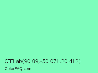 CIELab 90.89,-50.071,20.412 Color is a light green color and the nearest color is Aquamarine #7fffd4. Hex code #7dfdbc and RGB value is rgb(125,253,188). In RGB color space, this color is composed of 49% red, 99% green, 74% blue, In CMYK color space, this color is composed of 51% cyan, 0% magenta, 26% yellow , 1% black , In HSL color space, this color has a hue angle of 150° , 97% saturation and 74% lightness.