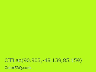 CIELab 90.903,-48.139,85.159 Color is a normal lime color and the nearest color is Green Yellow #adff2f. Hex code #b5fa1a and RGB value is rgb(181,250,26). In RGB color space, this color is composed of 71% red, 98% green, 10% blue, In CMYK color space, this color is composed of 28% cyan, 0% magenta, 90% yellow , 2% black , In HSL color space, this color has a hue angle of 78° , 96% saturation and 54% lightness.