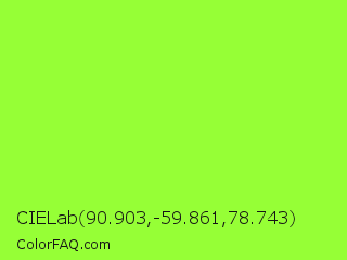 CIELab 90.903,-59.861,78.743 Color is a light green color and the nearest color is French Lime #9efd38. Hex code #96ff36 and RGB value is rgb(150,255,54). In RGB color space, this color is composed of 59% red, 100% green, 21% blue, In CMYK color space, this color is composed of 41% cyan, 0% magenta, 79% yellow , 0% black , In HSL color space, this color has a hue angle of 91° , 100% saturation and 61% lightness.