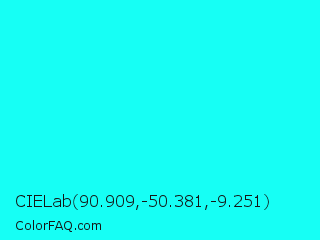 CIELab 90.909,-50.381,-9.251 Color is a normal cyan color and the nearest color is Loeen #15f2fd. Hex code #16fff5 and RGB value is rgb(22,255,245). In RGB color space, this color is composed of 9% red, 100% green, 96% blue, In CMYK color space, this color is composed of 91% cyan, 0% magenta, 4% yellow , 0% black , In HSL color space, this color has a hue angle of 177° , 100% saturation and 54% lightness.