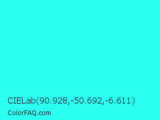 CIELab 90.928,-50.692,-6.611 Color is a normal cyan color and the nearest color is Loeen #15f2fd. Hex code #2bfff0 and RGB value is rgb(43,255,240). In RGB color space, this color is composed of 17% red, 100% green, 94% blue, In CMYK color space, this color is composed of 83% cyan, 0% magenta, 6% yellow , 0% black , In HSL color space, this color has a hue angle of 176° , 100% saturation and 58% lightness.