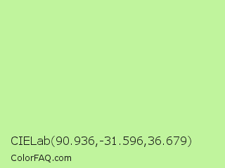 CIELab 90.936,-31.596,36.679 Color is a light green color and the nearest color is Reef #c9ffa2. Hex code #c0f49d and RGB value is rgb(192,244,157). In RGB color space, this color is composed of 75% red, 96% green, 62% blue, In CMYK color space, this color is composed of 21% cyan, 0% magenta, 36% yellow , 4% black , In HSL color space, this color has a hue angle of 96° , 80% saturation and 79% lightness.