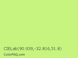 CIELab 90.939,-32.816,51.8 Color is a light green color and the nearest color is Sulu #c1f07c. Hex code #c7f47e and RGB value is rgb(199,244,126). In RGB color space, this color is composed of 78% red, 96% green, 49% blue, In CMYK color space, this color is composed of 18% cyan, 0% magenta, 48% yellow , 4% black , In HSL color space, this color has a hue angle of 83° , 84% saturation and 73% lightness.