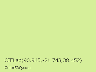 CIELab 90.945,-21.743,38.452 Color is a light lime color and the nearest color is Deco #d2da97. Hex code #d6ef9a and RGB value is rgb(214,239,154). In RGB color space, this color is composed of 84% red, 94% green, 60% blue, In CMYK color space, this color is composed of 10% cyan, 0% magenta, 36% yellow , 6% black , In HSL color space, this color has a hue angle of 78° , 73% saturation and 77% lightness.