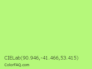 CIELab 90.946,-41.466,53.415 Color is a light green color and the nearest color is Sulu #c1f07c. Hex code #b5f87a and RGB value is rgb(181,248,122). In RGB color space, this color is composed of 71% red, 97% green, 48% blue, In CMYK color space, this color is composed of 27% cyan, 0% magenta, 51% yellow , 3% black , In HSL color space, this color has a hue angle of 92° , 90% saturation and 73% lightness.