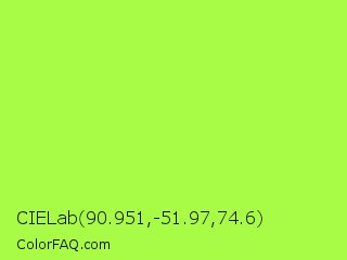 CIELab 90.951,-51.97,74.6 Color is a light green color and the nearest color is French Lime #9efd38. Hex code #a8fc45 and RGB value is rgb(168,252,69). In RGB color space, this color is composed of 66% red, 99% green, 27% blue, In CMYK color space, this color is composed of 33% cyan, 0% magenta, 73% yellow , 1% black , In HSL color space, this color has a hue angle of 88° , 97% saturation and 63% lightness.