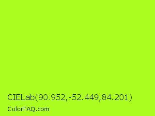 CIELab 90.952,-52.449,84.201 Color is a normal green color and the nearest color is Green Yellow #adff2f. Hex code #abfc1f and RGB value is rgb(171,252,31). In RGB color space, this color is composed of 67% red, 99% green, 12% blue, In CMYK color space, this color is composed of 32% cyan, 0% magenta, 88% yellow , 1% black , In HSL color space, this color has a hue angle of 82° , 97% saturation and 55% lightness.
